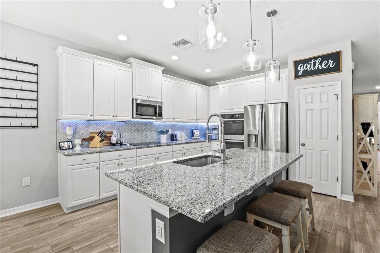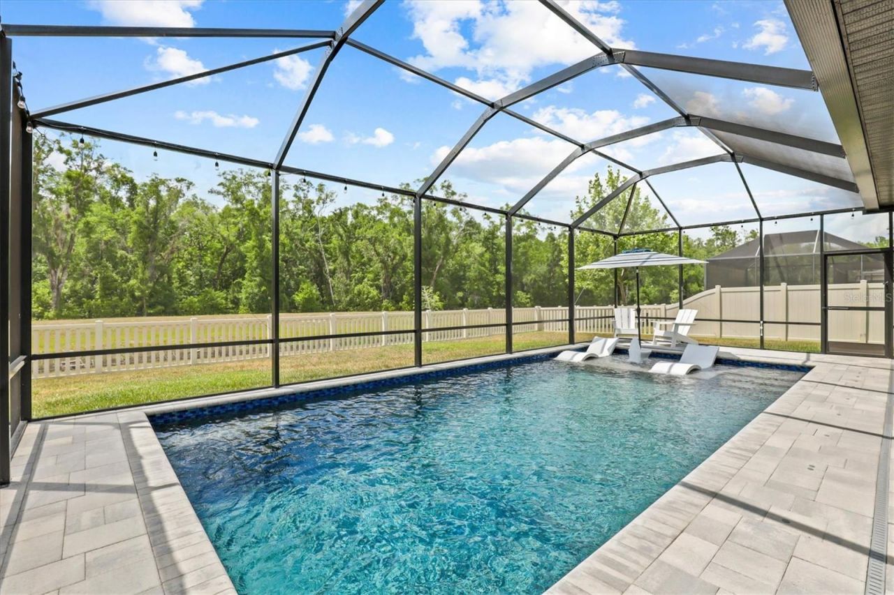 Welcome to this STUNNING 5-bedroom + BONUS ROOM MI Homes 'Barcello with Bonus' floor plan located in sought-after Talavera. Built in 2021, this home was designed with today's lifestyle in mind and offers an ideal setup for multi-generational living with three separate 'wing style spaces throughout the home for added privacy and flexibility. Step outside to your own private BACKYARD RETREAT featuring a NEW 2024 SALTWATER POOL with upgraded Pebble finish, Sun Shelf with seating, screened lanai with lighting, covered patio with outdoor fans, CONSERVATION VIEWS, No Rear Neighbors, and a FULLY FENCED yard perfect for relaxing or entertaining while enjoying Florida sunsets. Inside, the open-concept design features tile and luxury vinyl plank flooring throughout with NO CARPET anywhere. The living room showcases a CUSTOM ENTERTAINMENT WALL with built-in TV shelving, accent lighting, and a STONE FIREPLACE that creates a beautiful focal point. The kitchen overlooks the main living area and features Granite Countertops, Stainless Steel appliances, backsplash with lighting, and plenty of space to gather. Crown molding, custom touches, updated lighting, and ceiling fans throughout add style and warmth to the home. The 1st floor includes the PRIMARY SUITE plus 3 Additional Bedrooms thoughtfully positioned throughout the home with nearby bathrooms for privacy. Upstairs offers a LARGE BONUS ROOM, 5th Bedroom, and Full Bathroom creating the perfect guest suite, media room, or private retreat. Additional features include granite countertops in all bathrooms, tile showers, custom feature walls, a custom barn door, and a garage wired for electric vehicle charging. Residents of Talavera enjoy resort-style amenities including a community pool, clubhouse, playgrounds, tennis and basketball courts, and convenient access to shopping, dining, and the Suncoast Parkway.